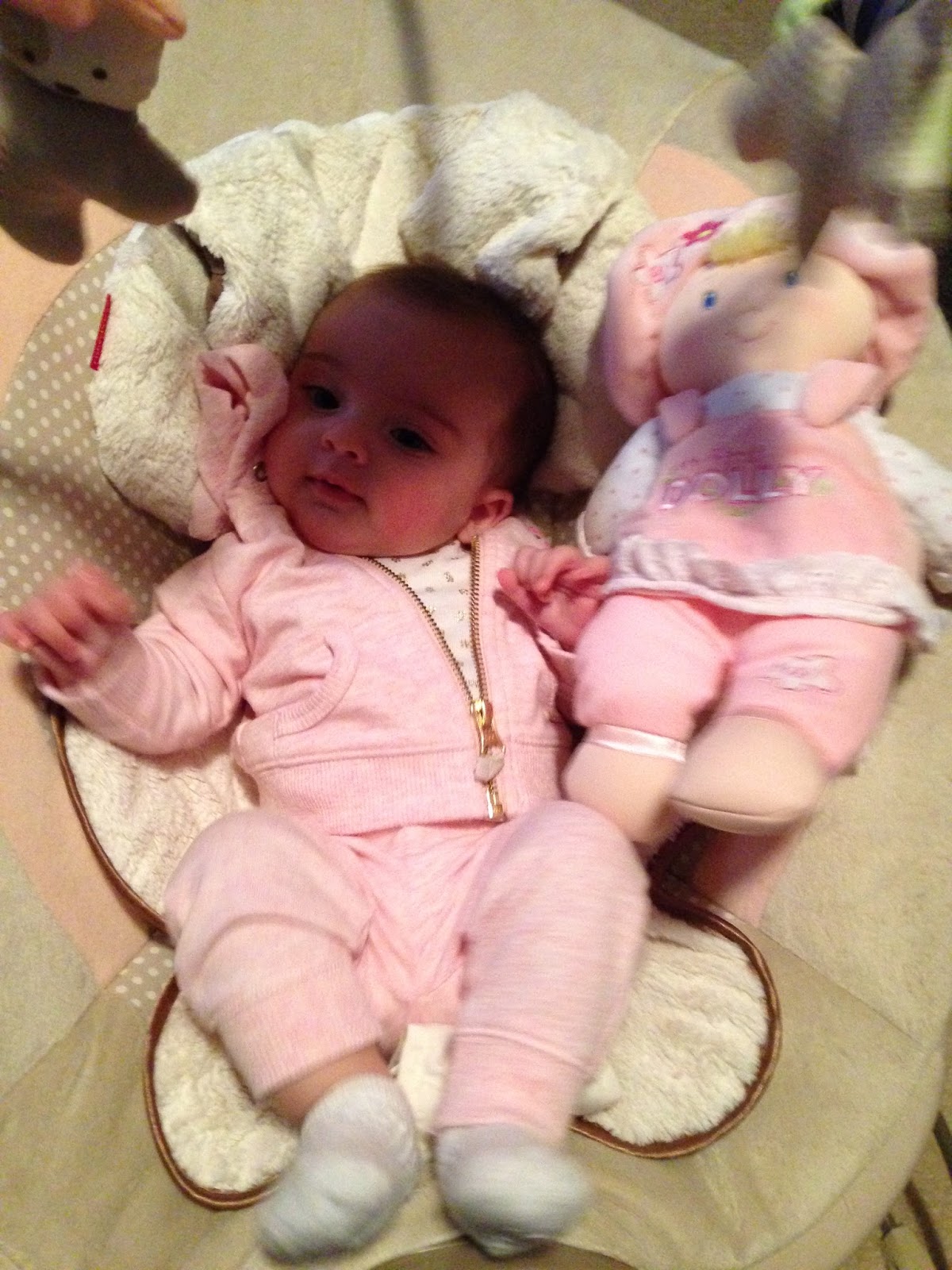 Normally the letdown after Christmas as we enter the cold winter months is a bummer, but this year it wasn't as bad as usual because we have you with us Kacey! At your pediatrician appointment, your new weight was 11 pounds 12 ounces and you had a few new milestones. You started sleeping in your crib at night. Your Daddy and I were sad to have you move on from your bassinet in the pack and play, but you were getting too big for it. We wanted to be able to keep you in the same room with us forever, but we know it is better for you to have room to grow and stretch out overnight. Daddy and I both check the monitor often and listen and watch you on the little screen. You even had a few night were you slept through the whole night (although recently we haven't been as lucky!) As great as you are doing in your crib overnight, you want no part of it during the day! You prefer your lamb swing, your car seat, or your all time favorite Mommy's arms for a daytime nap. But that's ok with me because I am so proud of how you are doing in the crib at night time.
