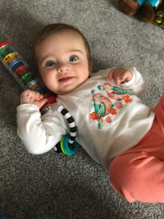 We have been so busy in your 7th and 8th months that I am writing to you about the last two months! I can't believe how fast time is going and how much you are growing and changing. At your 6 month appointment, you were 25 inches and 14 pounds 13 ounces. We won't get your next measurements until your 9 month appointment! You have been rolling over front to back and back to front non stop! You love to laugh and smile and play. You love to be held and walked around and shown things and want to be with Mommy and Daddy all the time! You now eat " at breakfast, lunch, and dinner" and before bed. You have rice or oatmeal cereal with fruit (bananas, apples, pears, peaches, or prunes) in it every morning for breakfast. Sometimes you have a second serving of fruit for lunch. At dinner, you have a fruit mixed in with a vegetable. The only vegetables that you and your tummy seem to be going for right now are sweet potatoes or carrots, but we will keep trying to give you more variety as you get bigger. I tried to let you try a jar of baby food chicken but you didn't like it! So we are going to pass on baby food jar meats and soon I will try to research how to puree "real" food for you. But for now I love to spoon feed you your fruits and veggies. You pretty much take two naps a day, one around 10am and one around 2pm in your swing, car seat or stroller, and then you sleep pretty good overnight in your crib,You have 1 little bottom tooth that just started to appear this past week and the one next to it looks like it is on the way. Teething has made it a little hard for you to sleep some nights, but a little Tylenol or Motrin seems to really help. I've been making you frozen strawberry or banana pops using these little mesh bags and you like to chomp and suck on those! You also started getting physical therapy for a weak neck muscle called torticollis at our house. Basically, you were stuck in the same position in my belly when you got big and almost ready to come out, which made you favor tilting your head one way, causing the left side of your neck to be not as strong as the left side. The first two weeks, your PT Miss Mary came twice a week, but you are doing so well that now she only comes once a week. Even though you have only had 5 sessions, she already thinks you will "graduate" soon as oppose to needing the 6 months of therapy that you qualified for. Overall, we just stretch and play in PT and you don't seem to mind it at all. In fact, each week we are amazed at the new things you are learning. Like this week you started being able to put little balls in and out of an open toy, which Miss Mary said is really a skill for older babies, who are 10 months! You constantly amaze us at all you can do. Lately, you haven't loved being strapped into your car seat or stroller. I think you feel restricted by your straps and want to be out and about with all of us! Hopefully, you will learn that it's important that you are safe wearing your straps and that we will only confine you when we really have to! Overall, watching you grow, playing with you and loving you has brought me daily joy these past 2 months.